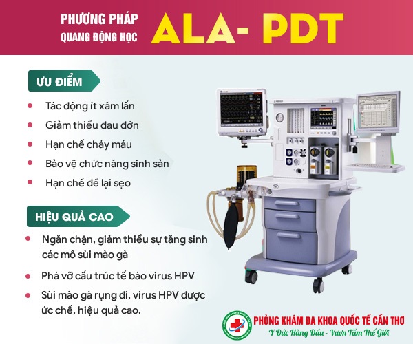 Chữa sùi mào gà tại Phòng khám Đa khoa Quốc tế Cần Thơ nổi bật với rất nhiều kỹ thuật điều trị hiện đại đem lại hiệu quả rất cao là công nghệ ALA PDT. Đây là một trong những cách chữa bệnh sùi mào gà hiện đại và rất phổ biến tại nhiều cơ sở y tế uy tín. Với cơ chế hoạt động là sử dụng chất cản quang, chùm ánh sáng đặc biệt và oxy thì bác sĩ sẽ nhanh chóng tiêu diệt được mầm bệnh một cách chính xác. Các nốt u nhú sùi mào gà sẽ sớm được tiêu diệt mà không gây ra sự đau đớn hay mất máu.